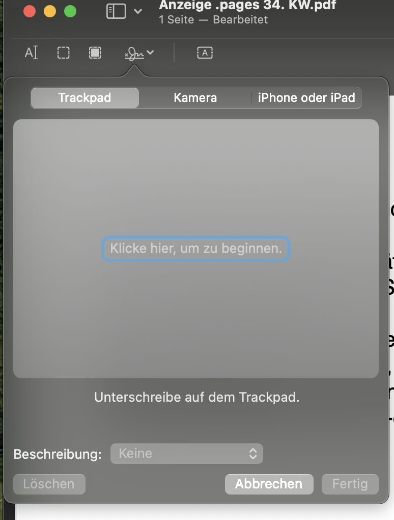 ich möchte auf meinem Mac Studio gerne PDF-Formulare in der Vorschau-App unterschreiben. Normalerweise gibt es neben der Option der Kamera und Trackpad noch das iPhone oder iPad. Aber diese Option wird mir wieso auch immer nicht angezeigt. Hat jemand eine Lösung?