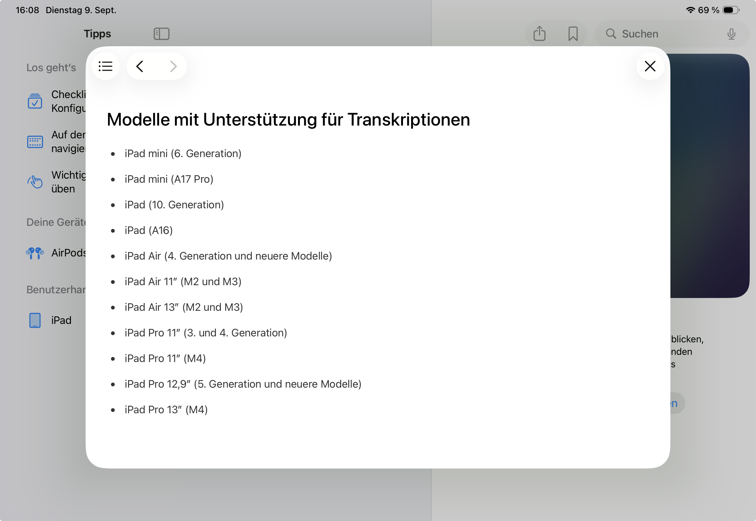 Das Transkript-Symbol wird nicht in der Sprachmemo App am iPad Pro mit iPadOS 18.6.2 angezeigt
