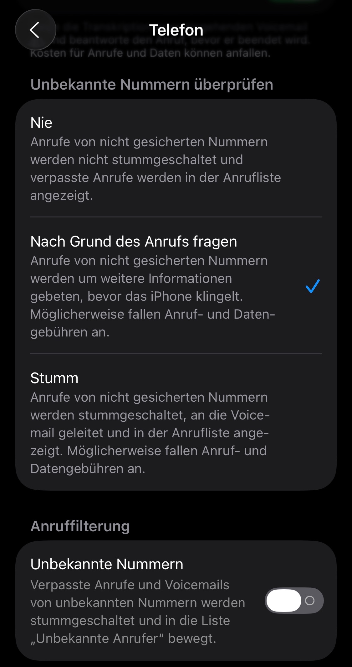 Call Screening (unbekannte Nummern überprüfen) funktioniert nicht