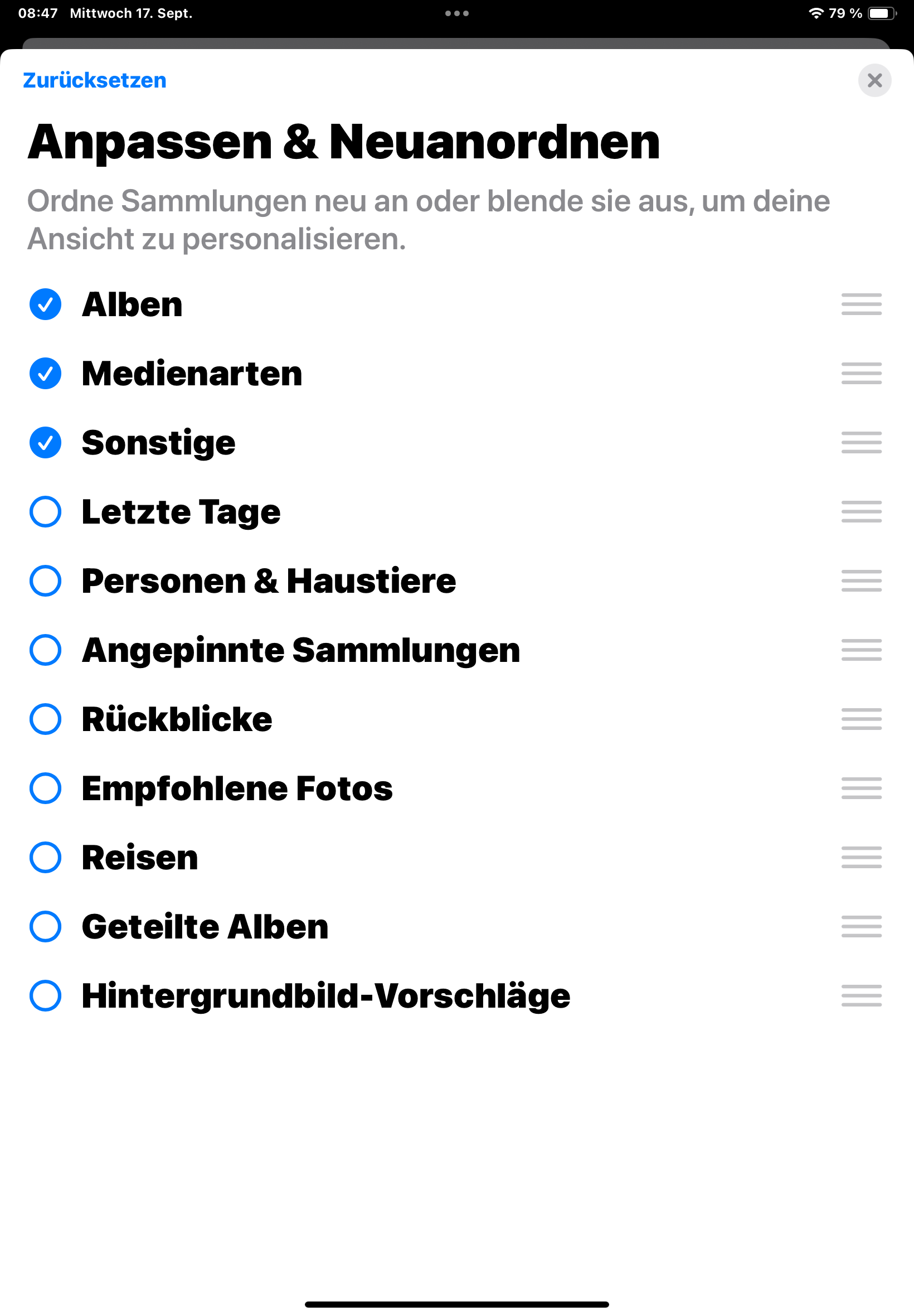 Bei iOS 26 fehlt in der Foto App die Funktion Anpassen/Neuordnen