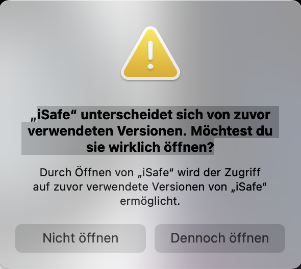 „iSafe" unterscheidet sich von zuvor verwendeten Versionen. Möchtest du sie wirklich öffnen?