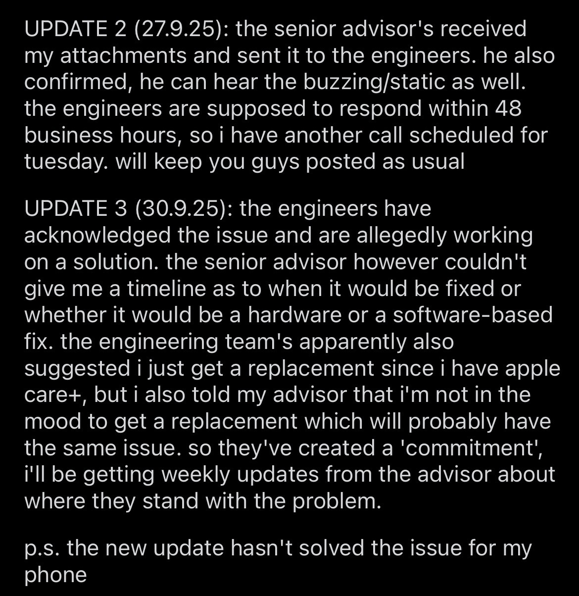 Ich verfolge das reddit Forum, am Dienstag erhält jemand ein Feedback von Apple. Es wurde an die Ingenieure weitergeleitet. Ansonsten konnte man mir im Apple Store nicht sagen, ob es die Hardware oder Software ist. Etwas was sich softwareseitig lösen lassen würde, wäre natürlich prima. Ich warte bis nächsten Mittwoch ob sich eine Lösung abzeichnet, ansonsten werde ich mein iPhone 17PM zurückgeben in der 14 tägigen Frist und mir das Geld zurückzahlen lassen. Das Risiko die 14 Tage Frist verstreichen zu lassen und es könnte ein Hardwaredefekt sein, ist mir zu groß. Wie geht ihr vor?
