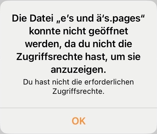 Ein wichtiger Punkt für die Zukunft ist, Dateinamen möglichst ohne Sonderzeichen wie ’, ä, ö oder ß zu verwenden, da diese gelegentlich Probleme bei der iCloud-Synchronisation oder den Zugriffsrechten verursachen können. Gleichzeitig lohnt es sich, die iCloud-Synchronisation zu prüfen, die Dateien in einen anderen Ordner zu kopieren, Pages oder das iPad neu zu starten und sicherzustellen, dass die aktuelle Pages-Version installiert ist.