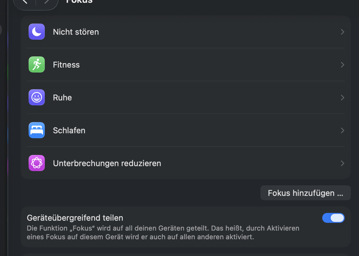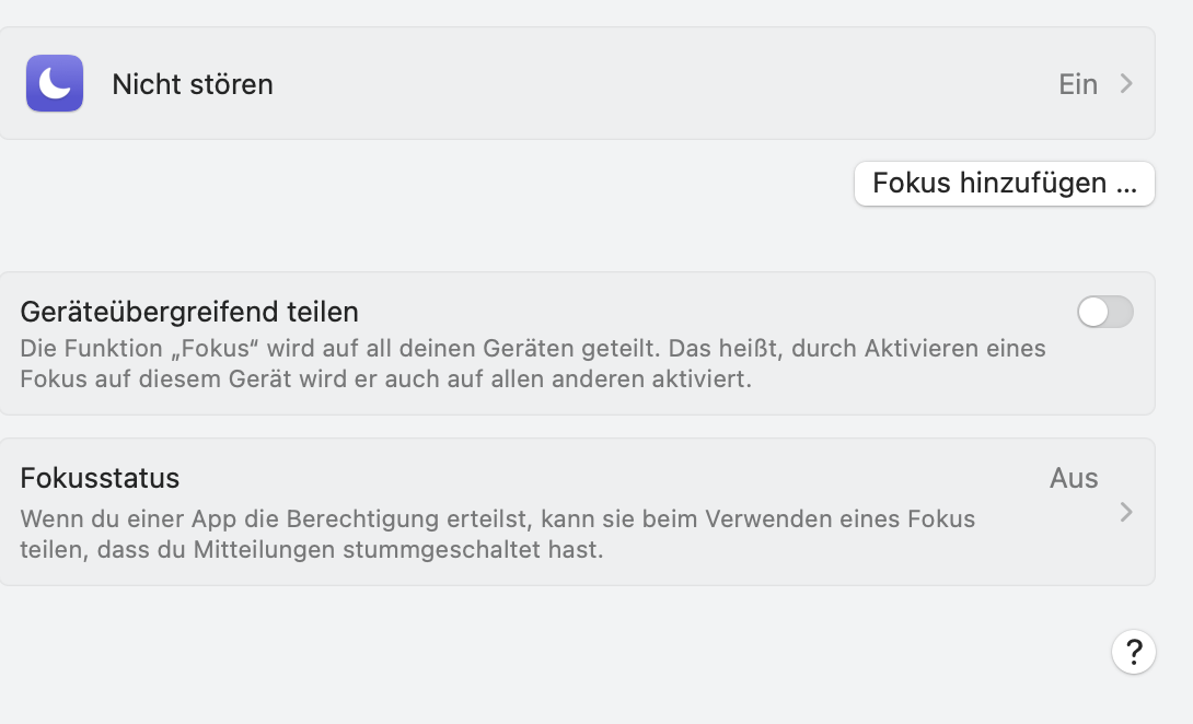 Neuerdings ist auf meinem Mac der Fokus "Nicht stören" (Halbmond) eingeschaltet und lässt ich nicht ausschalten. Unter Einstellungen steht unter Fokus «Ein», die Option «Aus» existiert nicht (oder ich finde sie nicht). Das Ganze ist äusserst lästig, weil nun auch eingehende Mails nicht mehr mit Ton angezeigt werden.