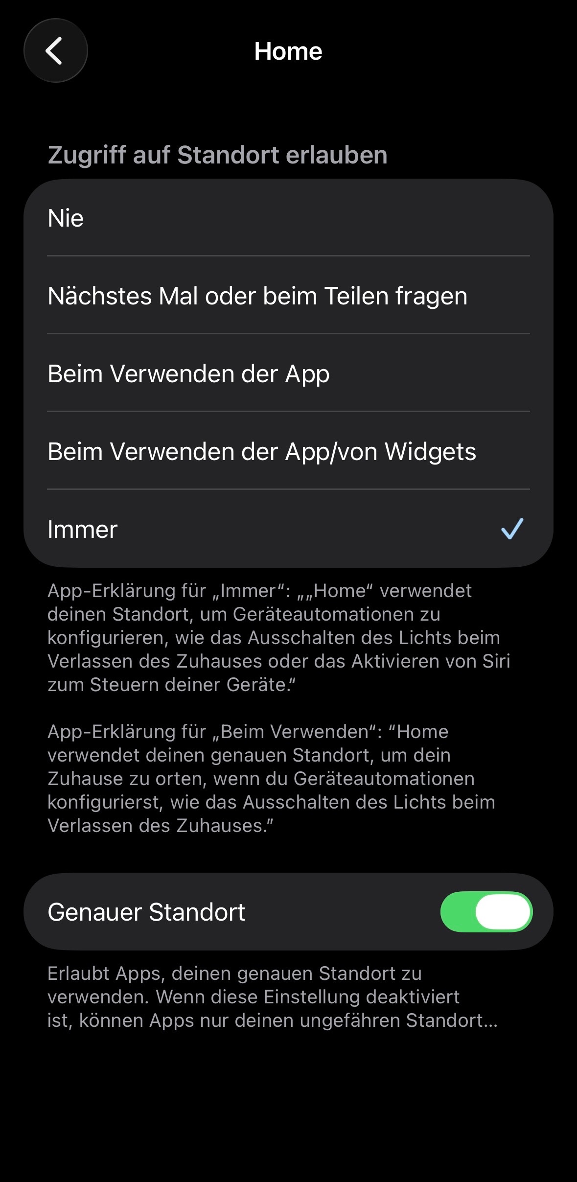 Zur Ausgangslage bei Homekit, meine Steuerzentrale ist ein Apple TV 4k mit der neusten iOS Version. Mir ist aufgefallen das seit dem Update iOS 26 meine Automationen zu Hause nicht immer ausgeführt werden. Speziell Automationen die mit Geofencing zusammen hängen. So zum Beispiel habe ich eine Automation das alle Steckdosen ausgehen wenn der letzte Bewohner das Haus verlässt. Oder auch das Abends eine Licht angeht wenn der erste Bewohner nach Hause kommt. Ich habe meine Zentrale schon neu eingerichtet und die eigentliche Zuhause Position stimmt auch. (Es gab ja in der Vergangenheit Probleme das die Privat Adresse verschoben war). Leider funktionieren die Automationen nicht. Wenn ich die Zentrale für kurze Zeit vom Strom trenne funktionieren die Automationen zum Teil für die erste Ausführung, dann nicht wieder. Ich habe nun Sorge das in der kommenden Jahreszeit meine Heizungsteuerung über das Geofencing ebenfalls nicht funktioniert. (alle Bewohner weg Heizung gedrosselt- erster Bewohner zu Hause Heizungen an). Es sind bei beiden Bewohnern die gleichen Probleme, ich gehe als Letzter, Automation alles Aus wird nicht ausgeführt, meine Partnerin kommt als erstes abends nach Hause das Licht geht nicht an.