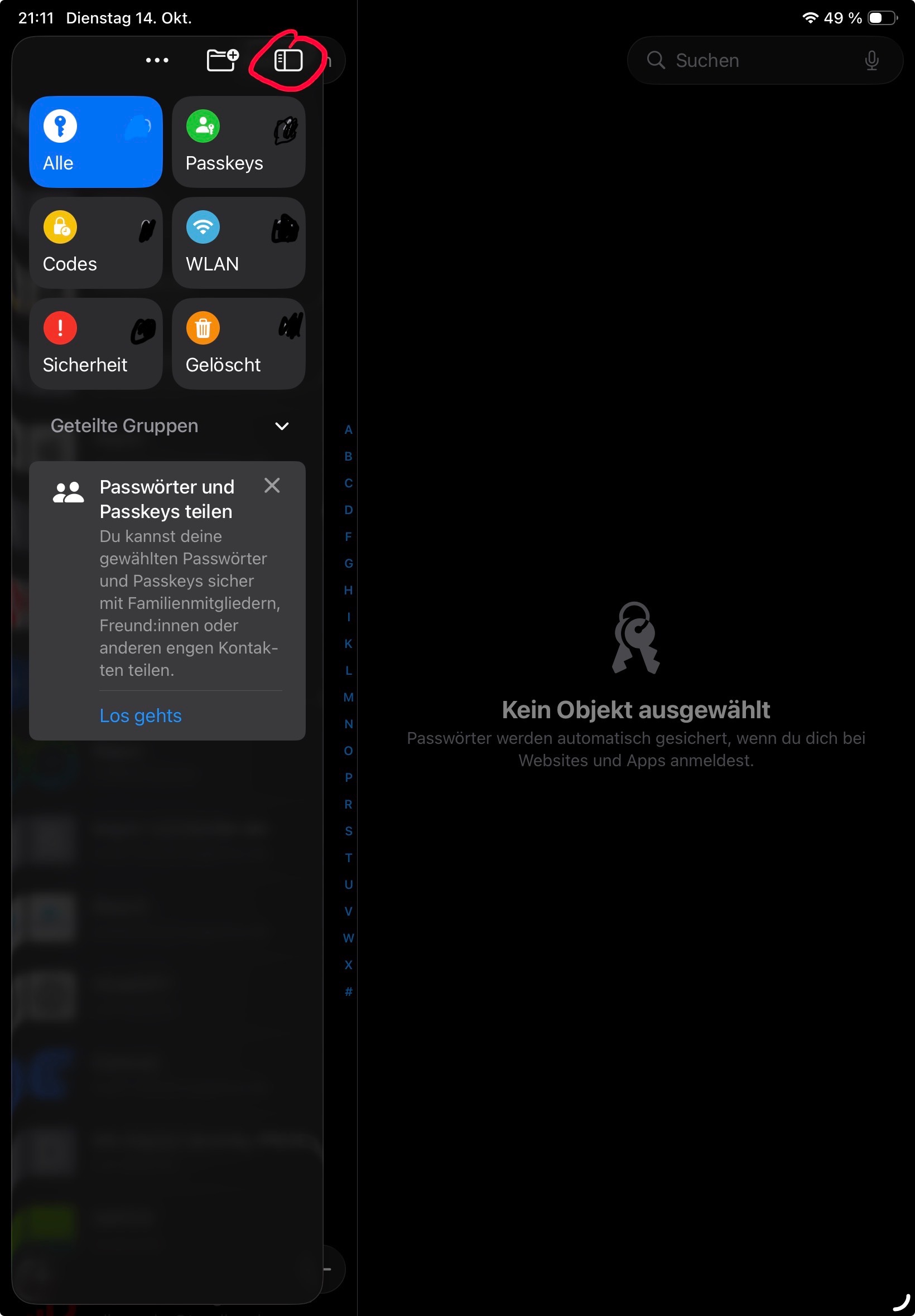 Beim öffnen der Passwort App erscheinen meine eingegebenen Passwörter/Websites nicht mehr. Es erscheint die Meldung: Kein Objekt ausgewählt. Passwörter werden automatisch gesichert, wenn du dich bei Websites und Apps anmeldest…… Wenn ich eine Website eingebe, kommt das Passwort automatisch. Ich möchte aber meine Websites und meine Passwörter wieder sichtbar haben, wenn ich die App öffne. Was kann ich tun?