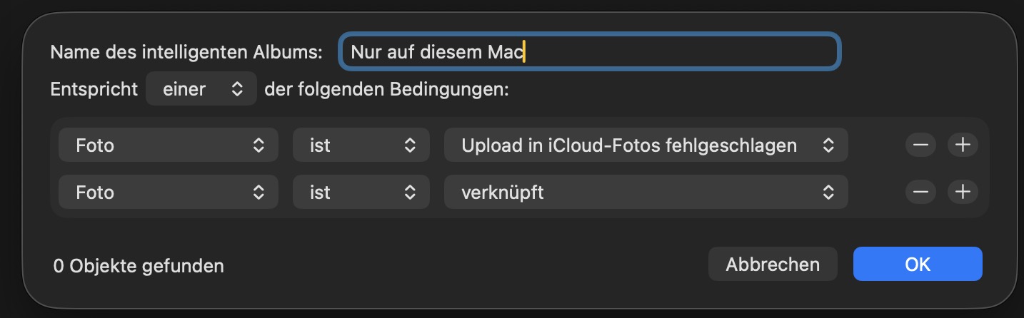 Fu könntest auch noch diesen in diesem Artikel (Status der Mediathek in der Fotos-App für macOS überprüfen - Apple Support (DE)) den Abschnitt "Objekte, die nicht in iCloud hochgeladen werden können" oder "Wenn „Objekte nur auf diesem Mac“ angezeigt wird" nachlesen.