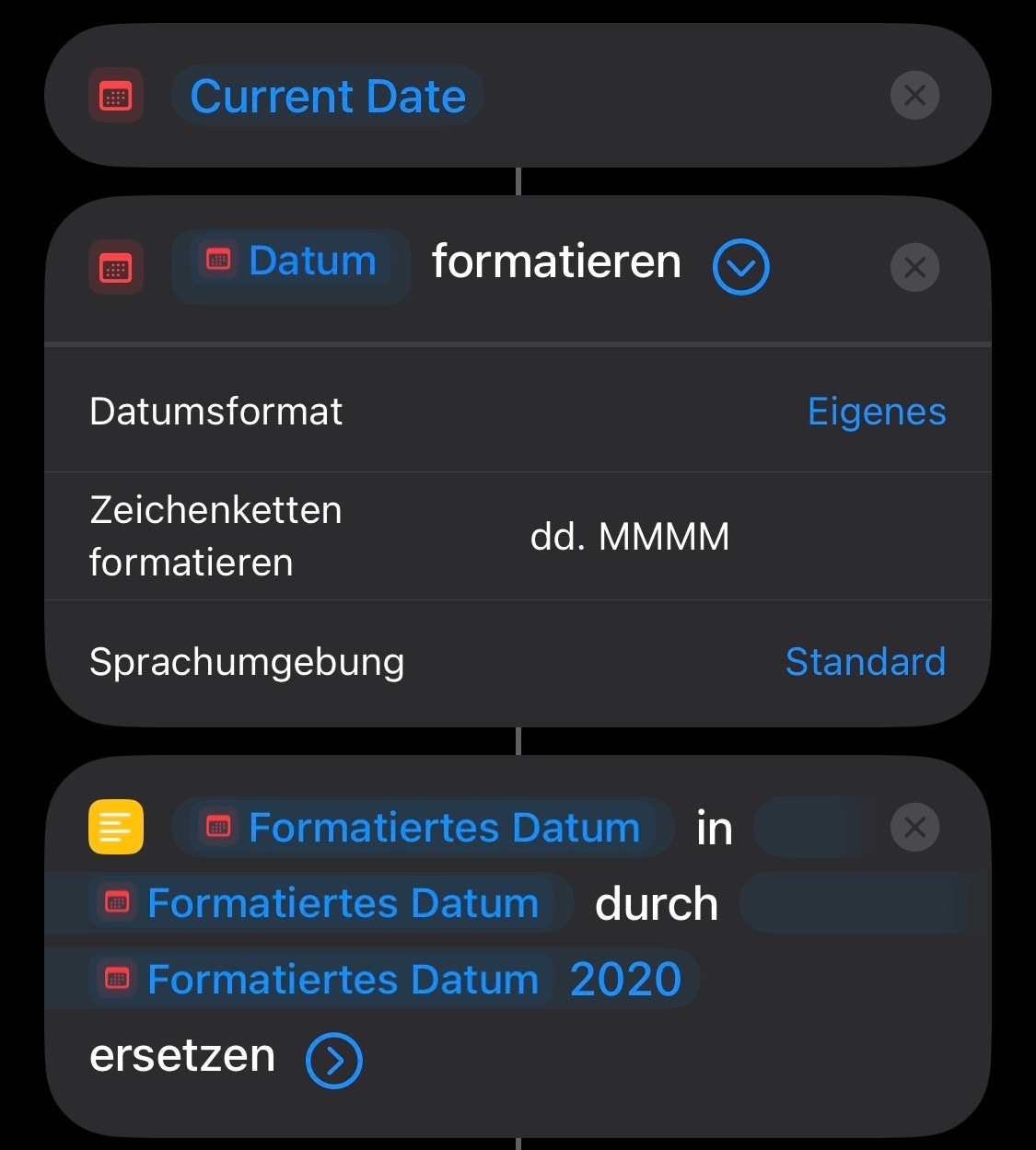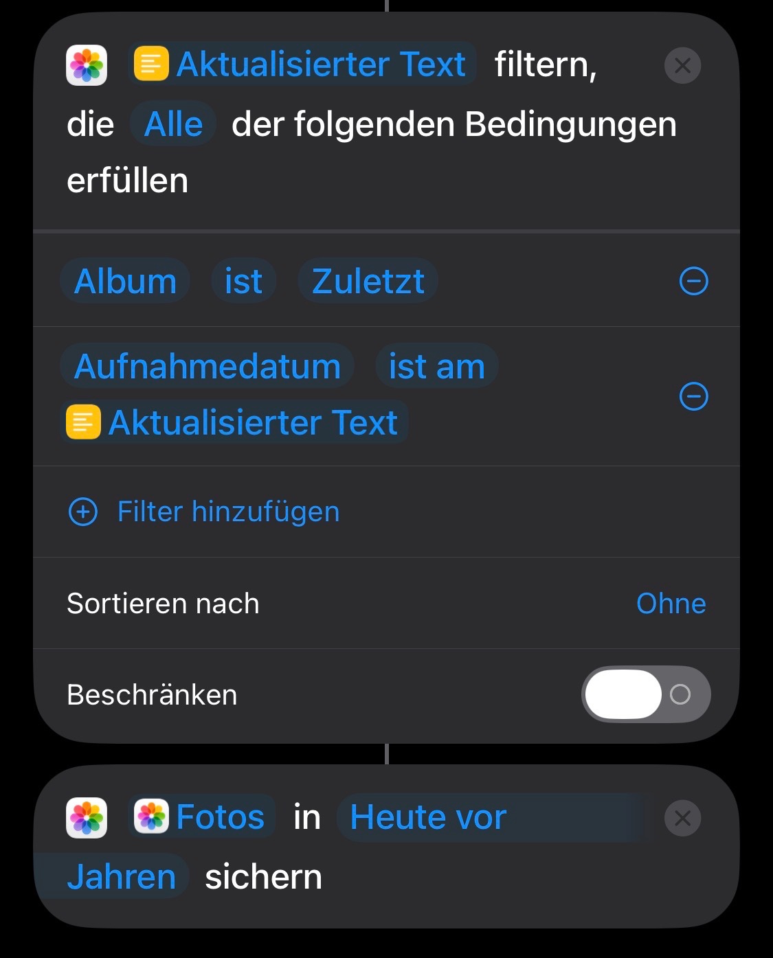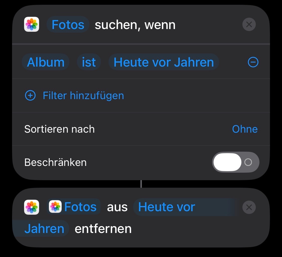 Über Kurzbefehle lässt sich das „aktuelle Datum“ abfragen, dieses wird Konvertiert in „aktuelles Datum“ + „Jahreszahl“