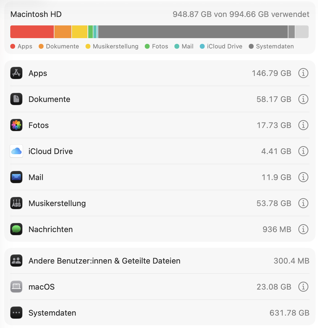 Wieso sind meine Systemdaten so hoch? Ich kann nichts mehr auf dem Rechner speichern (meine eigenen Daten) weil der grösste Teil von Systemdaten belegt ist! 631.78!!!! Ich habe eine SSD von 1T