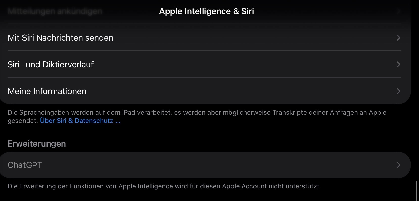Dennoch wir mir angezeigt das ChatGPT bei Apple Intelligence auf diesem Apple Account nicht unterstützt wird.