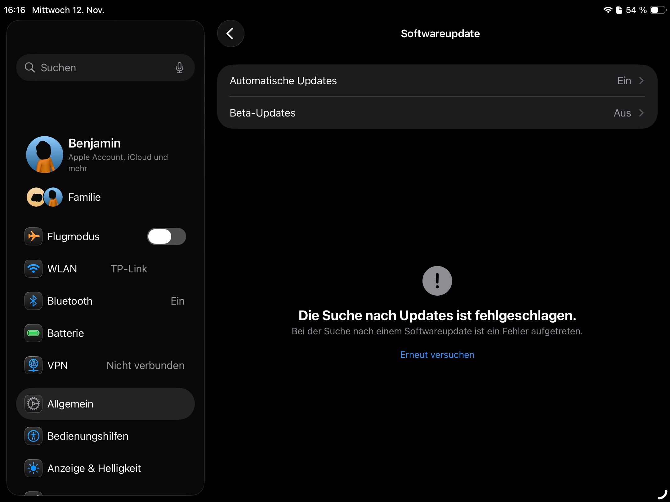 Als ich heute auf meinem iPad nach Softwareupdates suchen wollte kam in den Einstellungen plötzlich die Meldung „Die Suche nach Updates ist fehlgeschlagen.“. Das war noch nie so. Ich habe mein iPad zweimal neu gestartet, dann kurz das WLAN ausgeschaltet und auf „Erneut versuchen“ gecklickt, aber es hat alles nichts gebracht. Ich wäre sehr dankbar, wenn jemand eine Lösung für mich hätte.