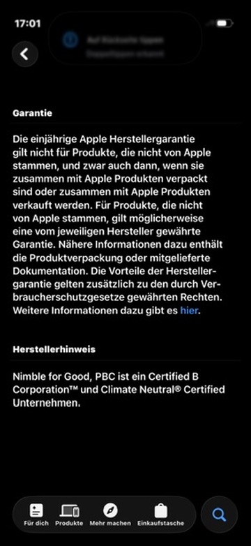 ich habe 3 Stunden mit APPLE Support, Mitarbeiter Verkauf usw. telefoniert. Obwohl das Gerät 2 Jahre Garantie hat, ist angeblich APPLE nicht zuständig. Ich soll mich direkt an NIMBLE wenden. Dort ist leider alles in Englischer Sprache und letztendlich weiss ich auch gar nicht, ob ich dort dann richtig gelandet bin.
