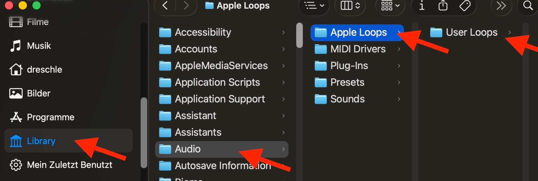 - Jetzt solltest du den Ordner "Library" sehen. Öffne ihn, dann den Unterordner "Audio", dann "Apple Loops". Dort findest du den Ordner User Loops, mit allen Loops, die du selbst erzeugt hast.
