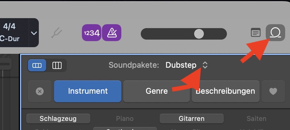 - In GarageBand, klicke auf das Loop Browser icon, dann setze im Loop Browser den Selektor für das Soundpaket auf "Alle Einblenden".