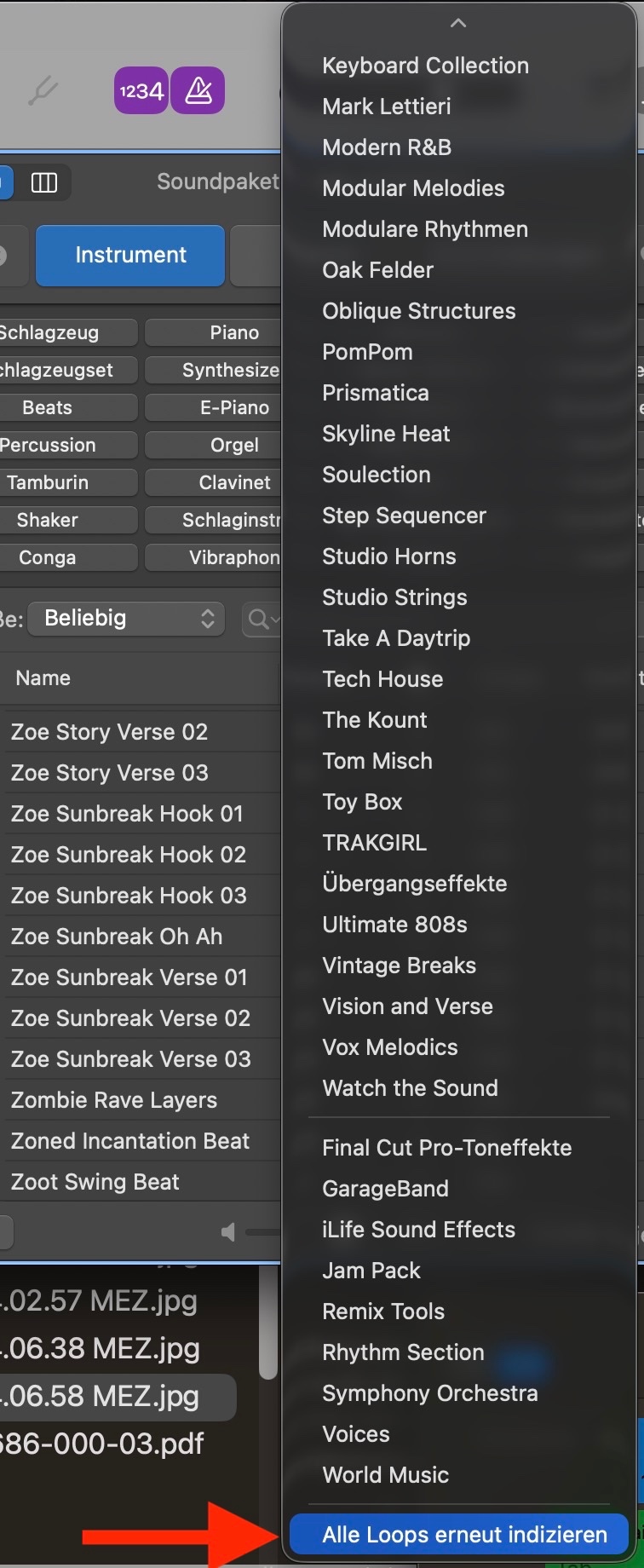- Unterhalb von "Alle einblenden", im selben Menü, am Ende der Liste alle Soundpakete findest du das Kommando "Loop Browser erneut indizieren".