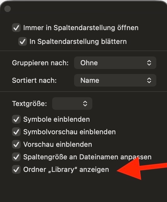 - Wenn du in dem Fenster, das sich öffnet , keinen Ordner "Library" siehst, gebe die Tastenkombination ⌘J ein, um die Darstellungsoptionen für den Benutzerordner zu ändern. Setze das Häkchen bei "Ordner Library anzeigen". Diese Option ist nur verfügbar, wenn man im Finder gerade den Benutzerordner geöffnet hat.