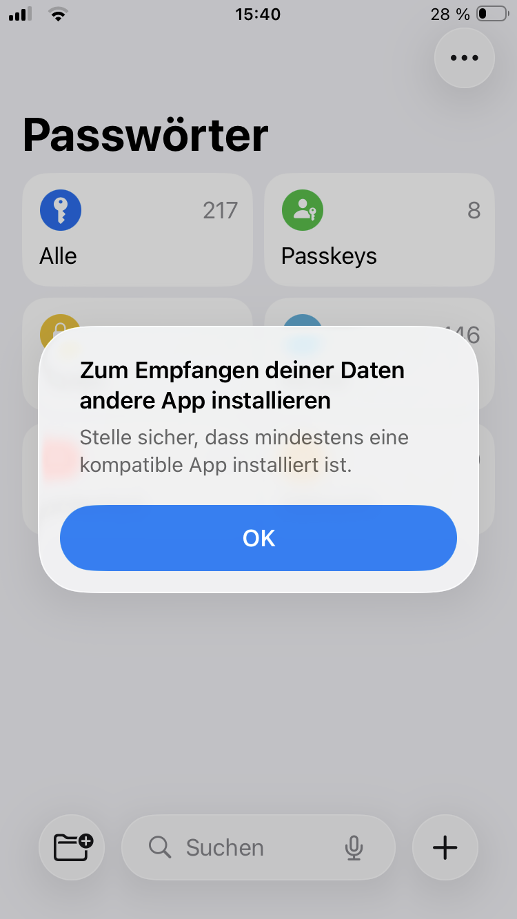 Es gibt ja die Export Funktion aus der iPhone Keychain Passwort App in eine andere App. Egal welche App ich vorher installiere (Bitwarden, Onepass), es kommt immer die Meldung ich soll eine kompatible App installieren, um den Export/Import durchzuführen. Was bitte ist denn eine solche kompatible App?