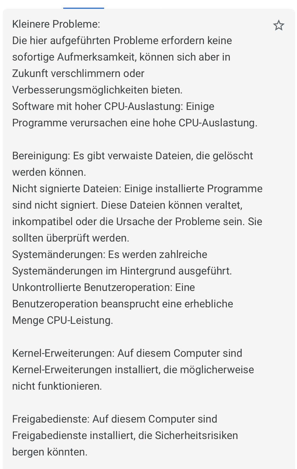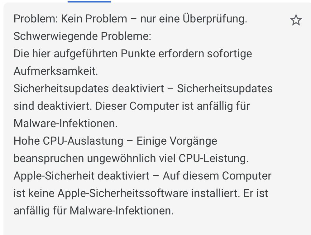Danke für den Tip. Ich habe es mit etrecheck gemacht. Interessanterweise gibt es nur die französische Version, ich dachte, dass eine ältere Version in englisch oder deutsch war. Aber es schein, dass nur geringfügige Probleme vorliegen, aber wie man diese löst, das weiss ich nicht. Und angeblich Aktualisierungsthemata zu Sicherheit. Wobei ich die Freigaben betr. Internetzugriff und Laufwerkzugriff so sehr einschränke wie möglich. Es gibt bei mir nur manuelle Updates, denn ich warte lieber bis die ersten Fehlerkorrektur-Updates durch sind, und bekannt ist, ob das System mit dem neuen Update nicht langsamer wird. Und der Virenschutz läuft nur 1x pro Tag, also nicht dauernd. Siehe Übersetzung in den 2 Screenshots in der Anlage. Die gelegentlich hohe CPU-Auslastung kommt sehrwahrscheinlich von ON1 PhotoRaw wenn indexiert wird. Das kann Stunden dauern. Interessant ist die Aussage von etrecheck, dass dieser Computer M1 iMac 24" mit "Performance: Bonne" bewertet wird und das gleichaltrige MacBookPro, auch mit M1 Prozessor mit "Excellente". Gefühlsmässig stimmt das, dass der MacBook flotter unterwegs ist als der iMac. Gruss Mario