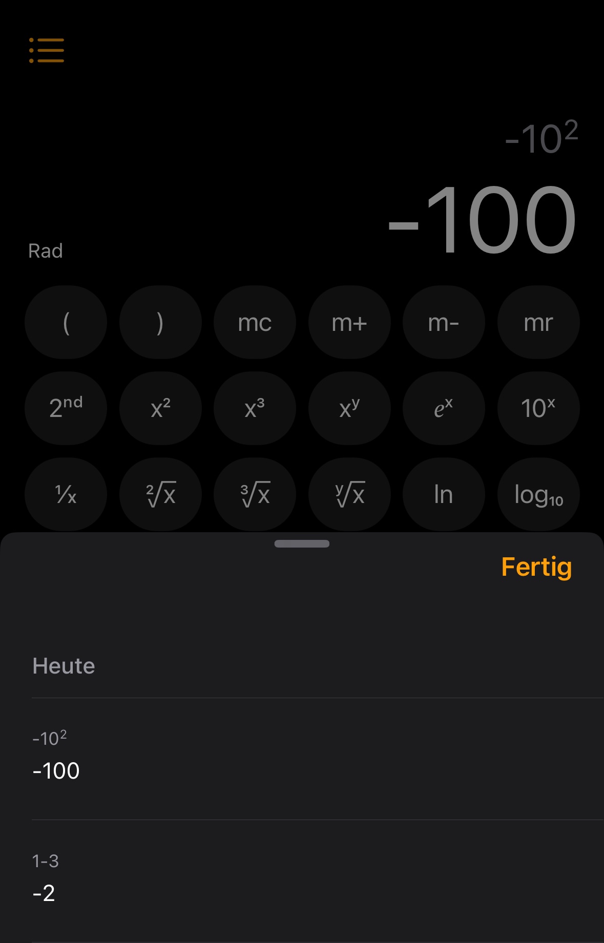 If you type in a subtraction calculation (e.g 5-10), then press "=" and then take this result (-5) to the power of ten (10^-5) by "pressing" 10^x-key, the calculator moves the negative sign in front of the figure 10 and calculates -10^5 which is obviously not what was intended.