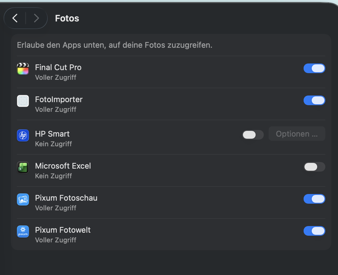 Apple schützt die Fotos-Mediathek über das sogenannte PhotosKit-Framework (PHPhotoLibrary). Dieses System legt exakt fest, welche Bereiche der Mediathek externe Programme überhaupt sehen dürfen. Das bedeutet: Drittanbieter-Software wie Pixum hat keinen vollständigen, direkten Zugriff auf die interne Ordner- oder Albumstruktur der „Fotos“-App.