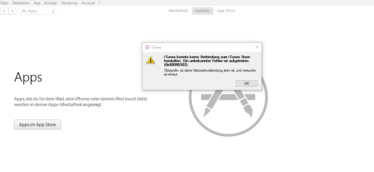 ich wollte heute auf mein altes iPad Mini (A1432), das ich als Musik Player verwenden möchte, ein paar Apps laden. Dafür habe ich mir eine ältere Version von iTunes auf den Laptop installiert. Soweit hat alles geklappt, doch wenn ich iTunes öffne, kommt immer der Hinweis: "iTunes konnte keine Verbindung zum iTunes Store herstellen.