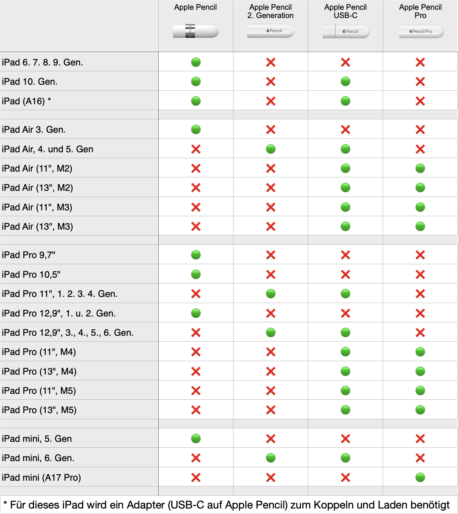 ❌ bedeutet, iPad und Pencil sind nicht kompatibel.