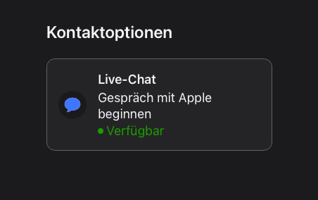 Nachdem ich mich in Mein Support des Apple Supports einlogge und diverse Themen auswähle, erscheint die ‘Weitere Unterstützung’ mittels eines ‘verfügbaren’ Live-Chats, den das Modul verhindert zu aktivieren. Was tun? Wie führe ich einen Live-Chat durch?