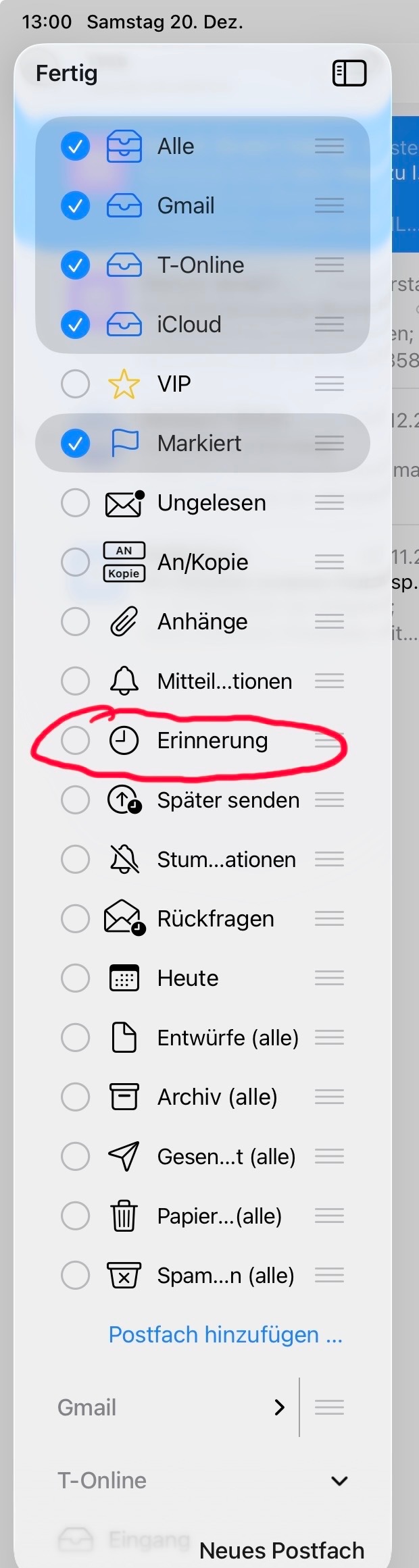 Mail App - Favoritenleiste Menupunkt Erinnerungen fehlt