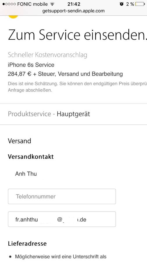 klicke ich mich durch "Zur Reparatur schicken", kommt 284,87€ + Steuer,