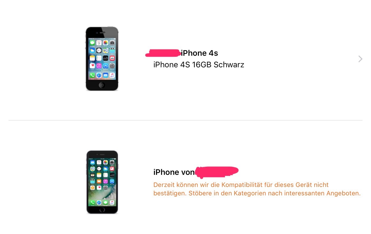in der Apple Store App wird mein mit der Apple verknüpftes iPhone nicht erkannt, die Fehlermeldung "Derzeit können wir die Kompatibilität für dieses Gerät nicht ermitteln" wird angezeigt, obwohl ein Produktbild meines iPhone 6s vorhanden ist.