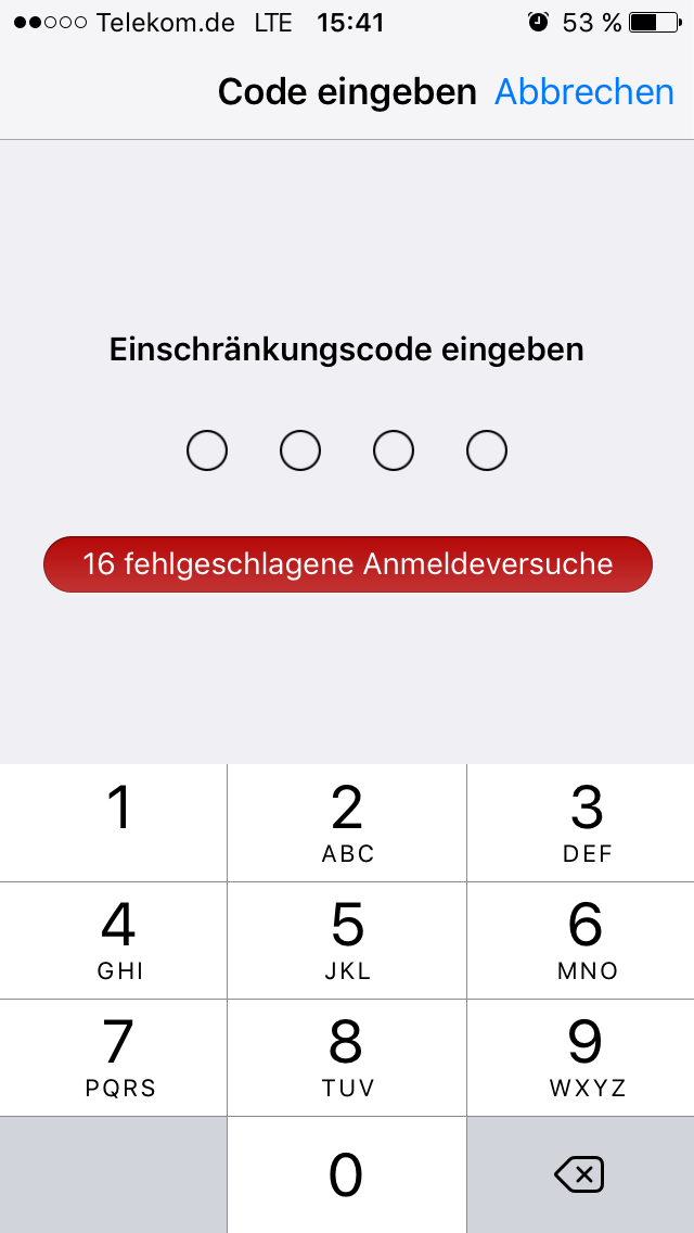 Wenn Sie den Einschränkungscode vergessen, müssen Sie Ihr Gerät löschen und als neues Gerät einrichten, um den Einschränkungscode zu entfernen. Eine Wiederherstellung des Geräts aus einem Backup reicht nicht aus, um den Einschränkungscode zu entfernen