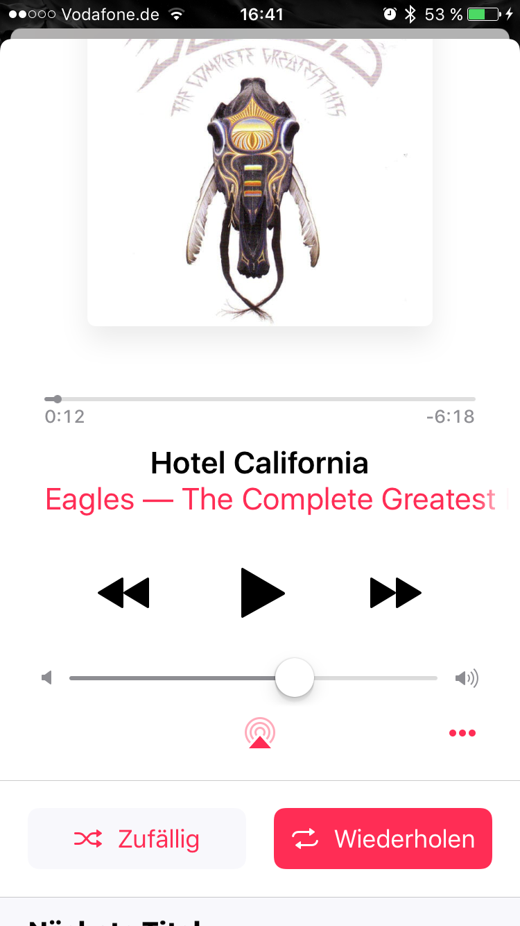 Jetzt schiebst du das Fenster nach oben, bis du die Möglichkeit hast, "Zufällig" oder "Wiederholen" auszuwählen. Tippst du jetzt auf Wiederholen, ist dies rot unterlegt und die Playlist wiederholt sich endlos. Tippst du ein zweites mal darauf, siehst du eine "1" darin stehen, das ist die Wiederholung des gerade gespielten Titels, auch endlos.