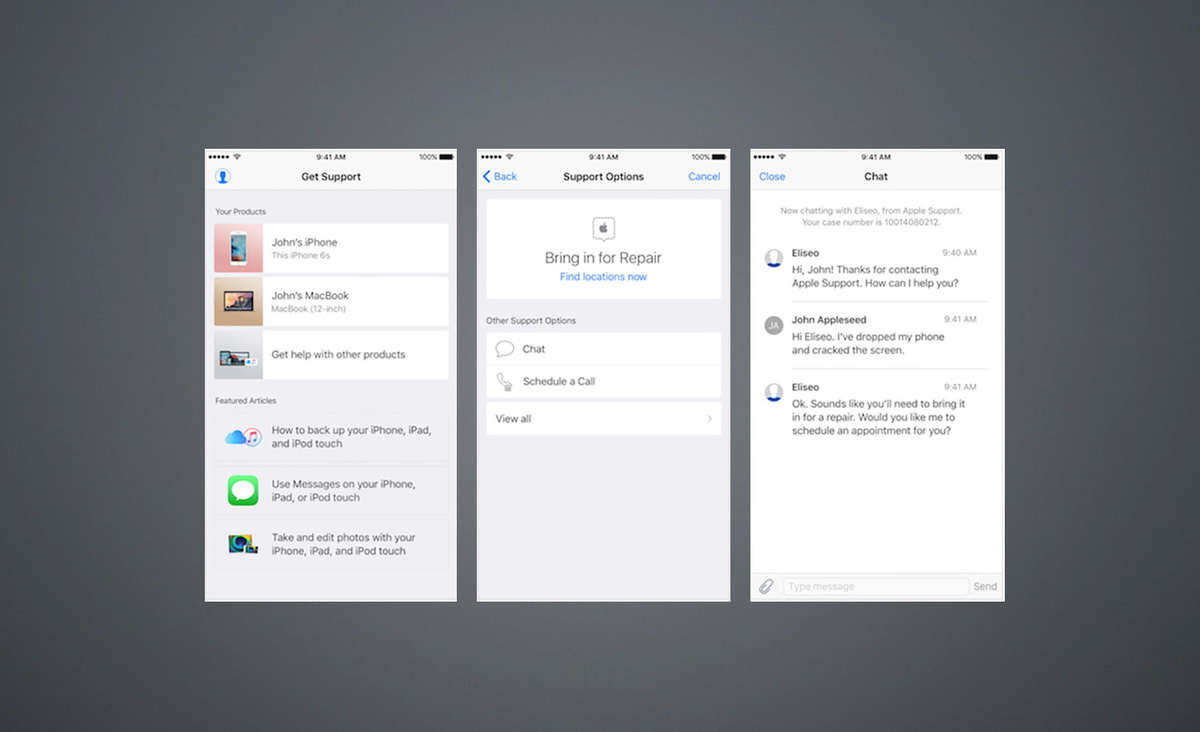 Hay una app desarrollada por Apple que se llama "Apple suppprt" que es muy útil para localizar artículos públicos de ayuda, mantiene un listado de tus dispositivos y lo que es más importante te ayuda a consultar con Apple para recibir asistencia técnica de manera organizada.