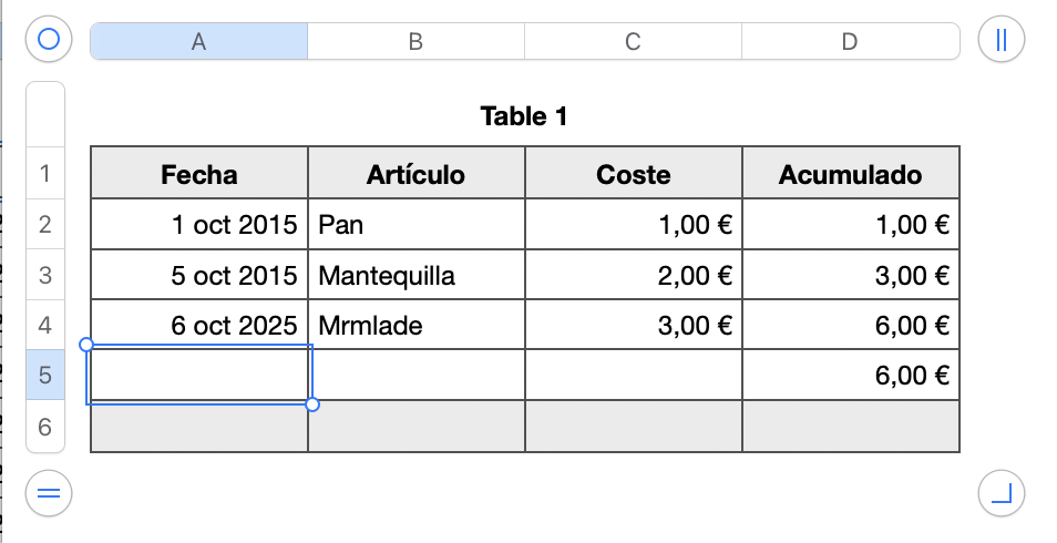 - Pulsa la tecla Intro (¡no la tecla Tab!). Esto desplazará el foco a la celda A5, lista para que introduzcas la siguiente fecha.