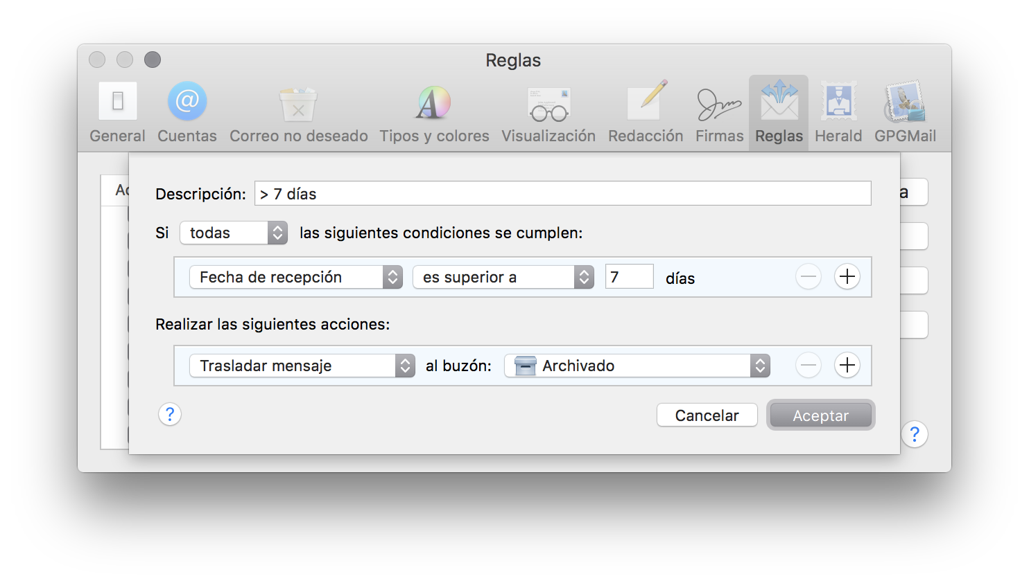 b) Hacer una regla igual, pero en las preferencias. En realidad no hará nada cuando se descarguen los mensajes porque las reglas de las preferencias se ejecutan cuando el mensaje se descarga, con lo que nunca tendrán 7 días cuando se descarguen. Pero no importa, la haces. Luego de vez en cuando (o programas un script con automator) seleccionas todos los mensajes de la carpeta de entrada y en el menú mensajes le das a "aplicar reglas a los mensajes seleccionados" y moverá a la carpeta que hayas indicado los mensajes de más de X días. Sería así la regla: