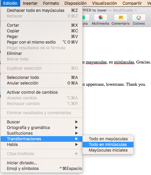 me gustaría saber como convertir un texto en Pages, escrito en mayusculas, en minúsculas. Gracias.