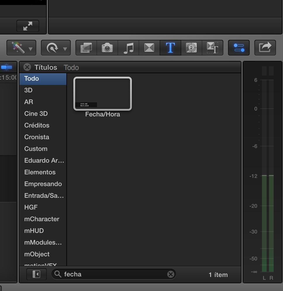 5.- En el explorador de títulos ve al buscador que está en la parte inferior del explorador y escribe "fecha". Ahí te va a aparecer de inmediato el título "fecha/hora". Arrástralo sobre el clip que quieras titular.