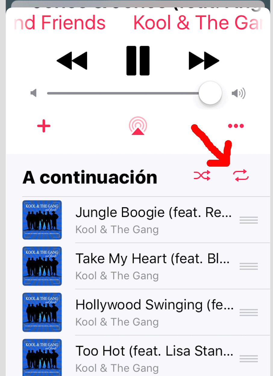 Selecciona una canción, cuando te aparezca toda la pantalla que muestra el título, imagen, etc., deslízate hacia abajo y te aparecerá el botón shuffle y el botón repetir, desactíva este último y listo.