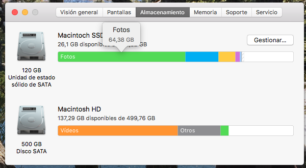 Hola, tengo un Macbook pro con macOS Sierra, tengo instalado un disco SSD en la unidad óptica de mi Macbook Pro y el disco duro que viene por defecto. El sistema operativo esta instalado en la unidad SSD, ademas de todas las app en el. Tengo un problema con la App Fotos, la biblioteca de esta la tengo guardada en el disco que viene por defecto en mi mac con un peso aptos. de 54 gb (entre fotos y videos), pero al ver el espacio ocupado en mi Macbook Pro me aparece que tengo 64 Gb de espacio ocupado por la biblioteca de fotos en el disco SSD, siendo que esta biblioteca esta guardada en el otro disco duro.