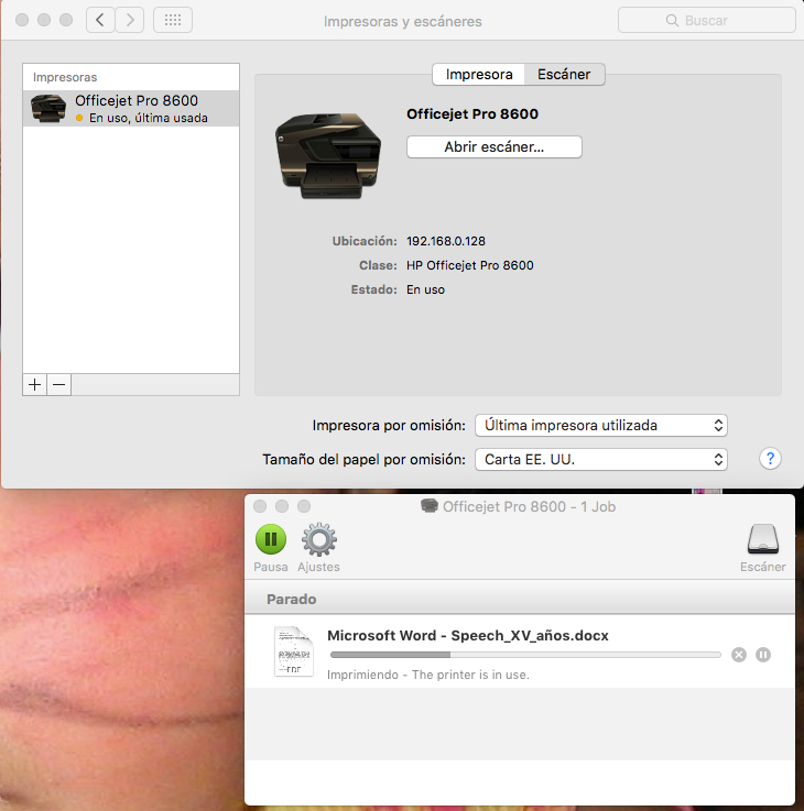 Estoy teniendo problemas de impresión con los dispositivos Apple (iMAC, iPad, iPhone) y con la impresora conectada vía wireless. La impresora es una HP Officejet Pro 8600 y hasta hace una semana funcionaba adecuadamente, tanto con la impresión como con el escáner. Lo único que ha cambiado que yo recuerde es la actualización del software. La conexión via Wireless funciona e indica que la impresora esta conectada correctamente. Tanto es así, que el escáner funciona adecuadamente. Antes de enviar el documento, la impresora indica que esta lista, pero cada vez que envío un documento a impresión, hace el proceso de impresión pero inmediatamente indica que la impresora esta en uso. Este mensaje aparece en todos los tres dispositivos apple que utilizo. He desinstaladlo la impresora y he seguido los pasos tal como lo indican en el soporte técnico, pero sigo sin éxito. Los mas interesante que con el sistema windows, no tengo problemas con la impresión, tanto con Windows 7 así como Windows 10.