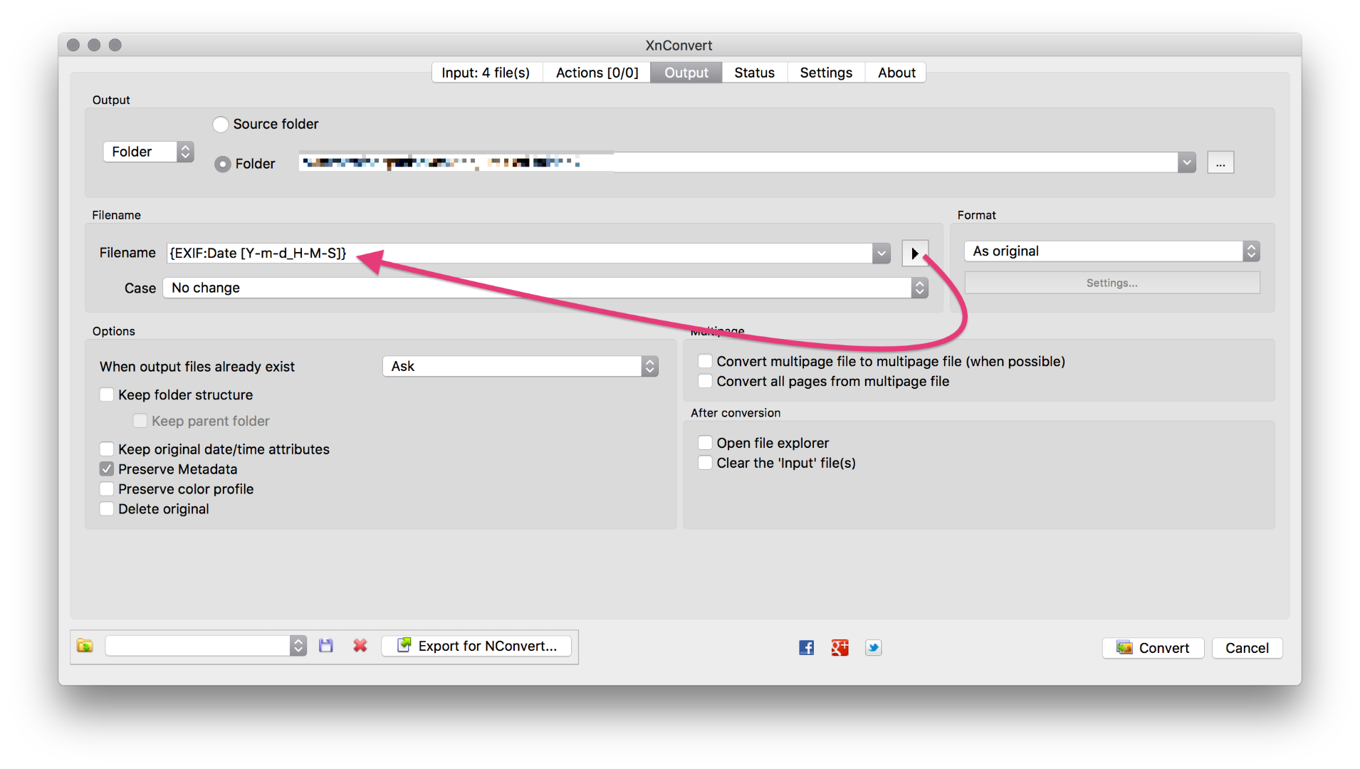 Con ella puedes hacer la conversión pero diciendole que no quieres hacer nada a las fotos, directamente te vas a la pestaña de salida en la que eliges la fecha de los EXIF como nombre de los ficheros.
