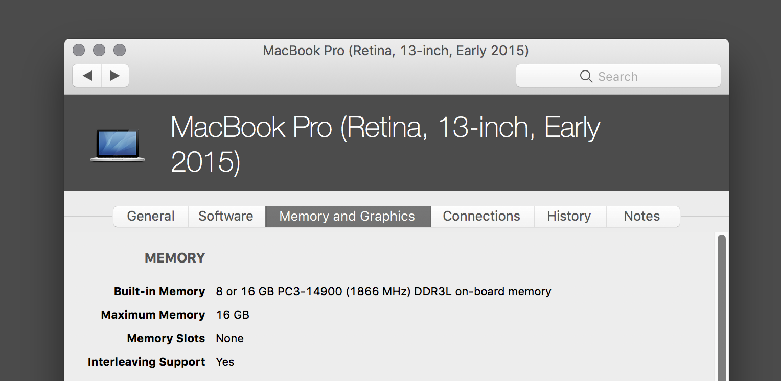 Buenas noches, al hacer clic en especificaciones de mi Mac book pro vi, en un apartado que decía que puedo ampliar a 16 GB de ram, tengo un macbook pro retina 13" principio del 2015. 2.7 GHz, Intel Core i5, 8GB 1816 MHz DDR3.