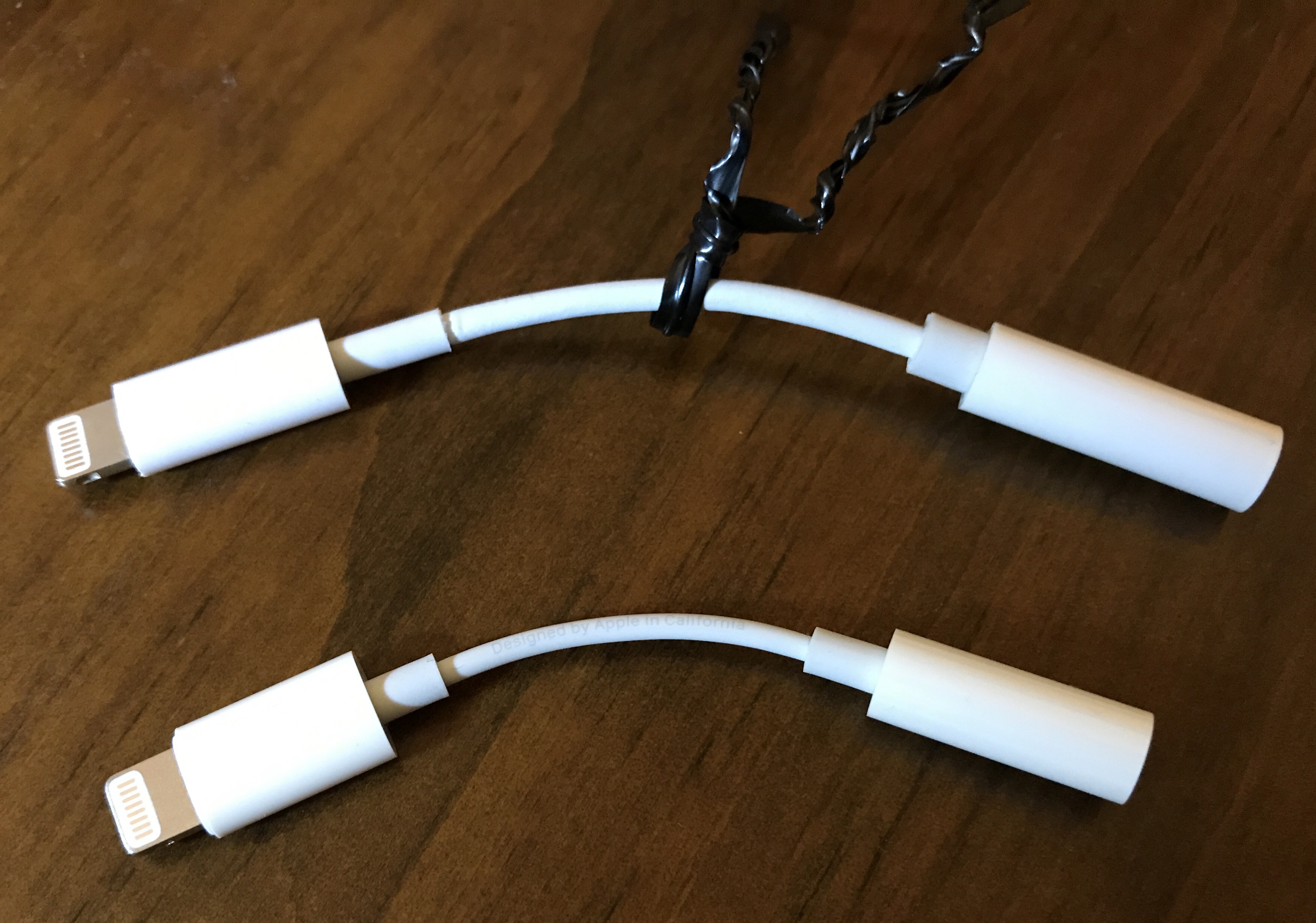 He identificado una diferencia física entre los dos adaptadores (originales los dos). El que me vino con el teléfono tiene un cable grueso y ligeramente semirígido, el que compré proveniente de una tienda Apple, está construido con un cable muy delgado y muy flexible. Este último es reconocido perfectamente por el iPhone 7 con todas sus funciones.