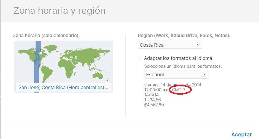 La zona horaria de Costa Rica es GMT-6 y en el icloud sale GMT-7 lo que ocasiona problemas al sincronizar calendarios, alguien sabe como corregirlo?