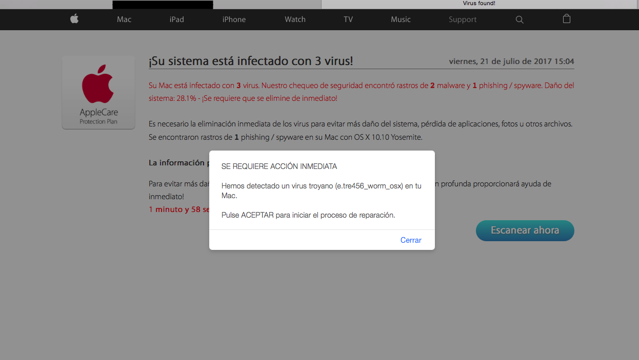 Siempre acosa este software en safari, cada que abro un sitio, la advertencia acecha, con la perversa intención de venderte su antivirus, que en realidad, son virus para apple. ¿Cómo me puedo deshacer de ésto? Ya intenté en preferencias y nada. Utilza la imagen de apple care y te insita a escanear tu sistema, lo hice y te pide que instales el antivirus Mckeeper. Ahí me percaté el engaño.