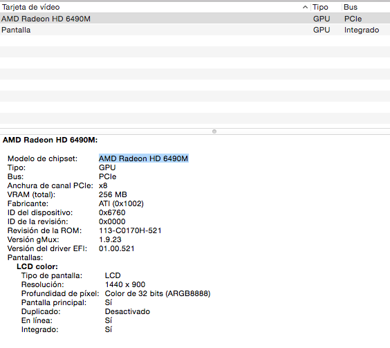 hoy me puse a revisar el informe de sistema de mi MacBook Pro 15 (early 2011) y me di cuenta que no reconoce la tarjeta de gráficos integrada. Debería ser una Intel HD 3000 pero mi la mac ya no la lee. No sé qué ha podido pasar, la última vez que revisé seguía ahí. La seleccionada está por default: la AMD Radeon HD 6490M. ¡Pero la Intel HD 3000 ya no está!