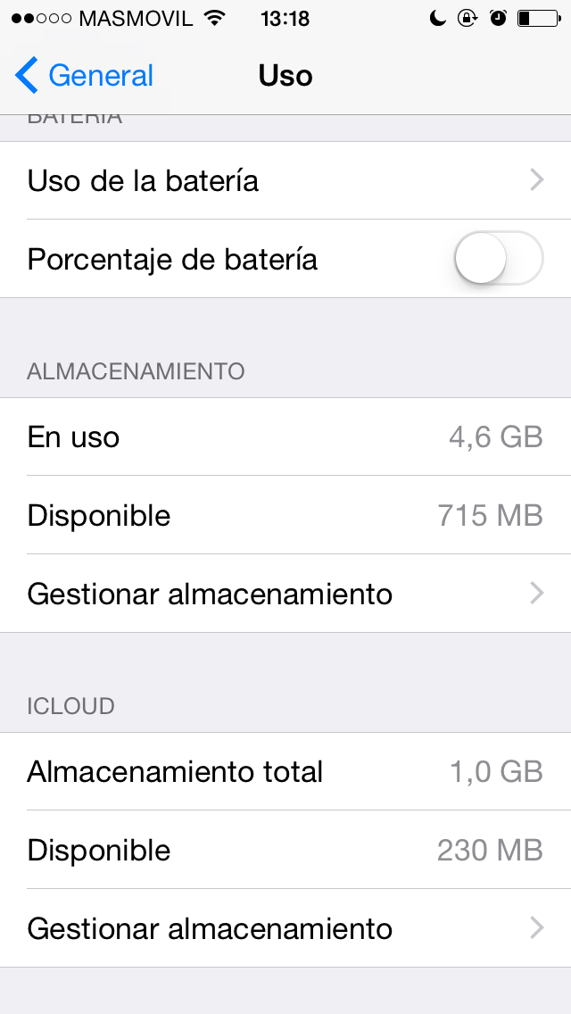 - Si entro en el iPhone en Ajustes --> General --> Uso, tengo en el iPhone 715 Mb disponibles