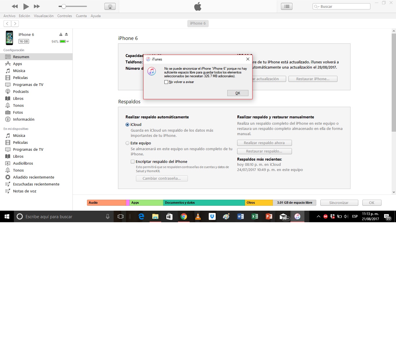 No se puede sincronizar el iphone porque no hay suficiente espacio libre