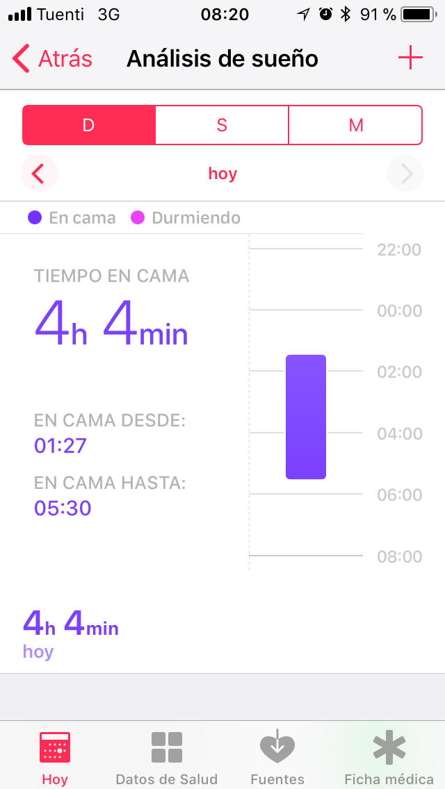 Yo tengo una app de monitorización del sueño en el iPhone y va bien. Esa sí registra los movimientos y te da una gráfica del tiempo despierto, el tiempo durmiendo y un tanto por ciento de la calidad del sueño en base al tiempo que pasas en cada fase del sueño, si es sueño ligero por que detecta que te mueves, o sueño profundo cuando no detecta movimiento. Dicha app necesita que el iPhone esté en contacto con la cama, para detectar los movimientos. Esta app que te comento no dispone de app para el Watch, pero aunque la tuviera, yo cargo todas las noches el Watch, así que no lo llevo puesto durante el sueño.