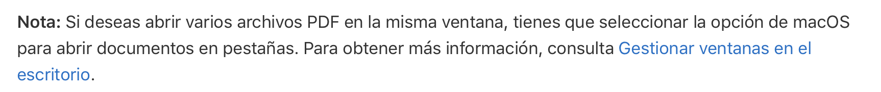 Hola buen dia, quiero abrir varios archivos PDF en Vista Previa, pero se abren siempre en ventanas separadas. Aun que en las Preferencias esta puesto: Abrir todos los archivos en una ventana: usa una ventana para todos los archivos que abras en Vista Previa, sin importar cuándo los abras.